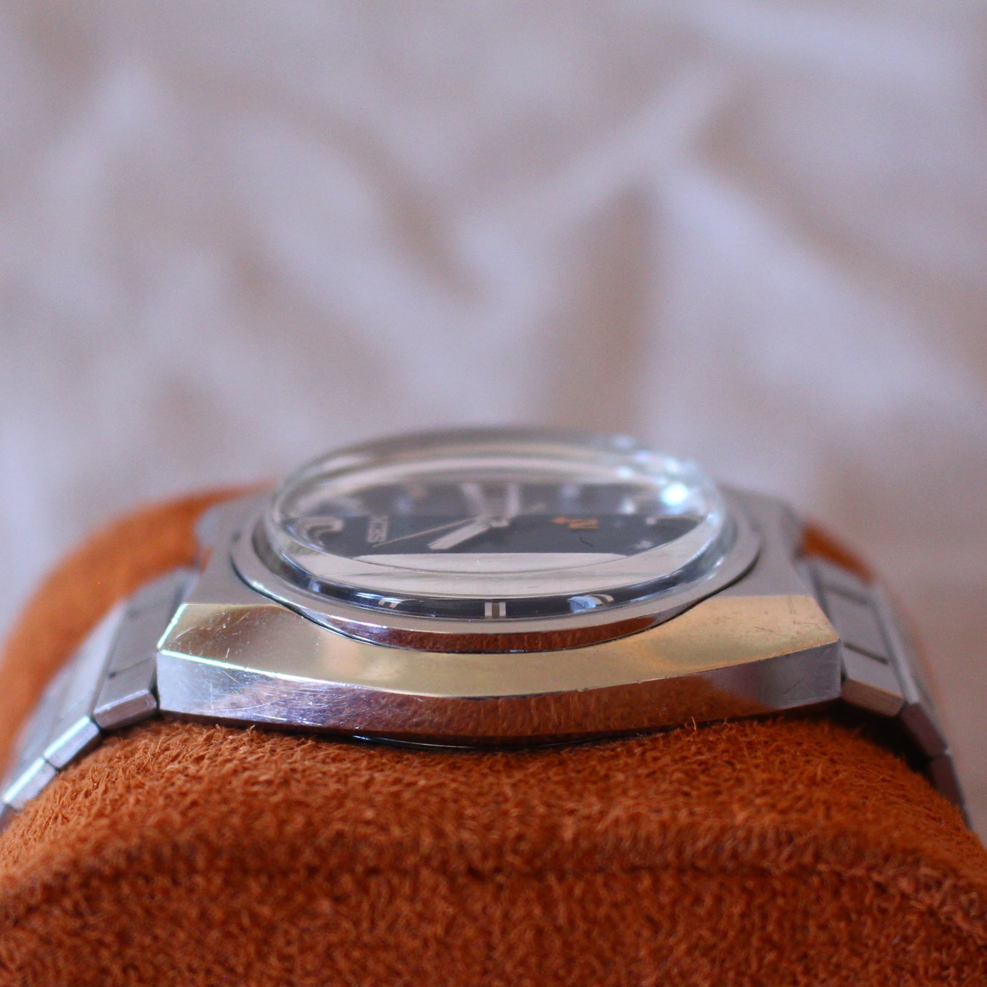 This is a rare and technologically fascinating Seiko Elnix, reference 0703-7080, from November 1974, a true product of the innovative transitional period between mechanical and quartz watchmaking. The watch features a classic 70s cushion case in stainless steel, housing a beautiful deep blue brushed dial with applied indices and a day-date complication (with a Kanji day wheel). A standout feature is its rare and complex internally faceted acrylic crystal, which creates a brilliant play of light while keeping the outer surface smooth and far less prone to chipping than external facets.