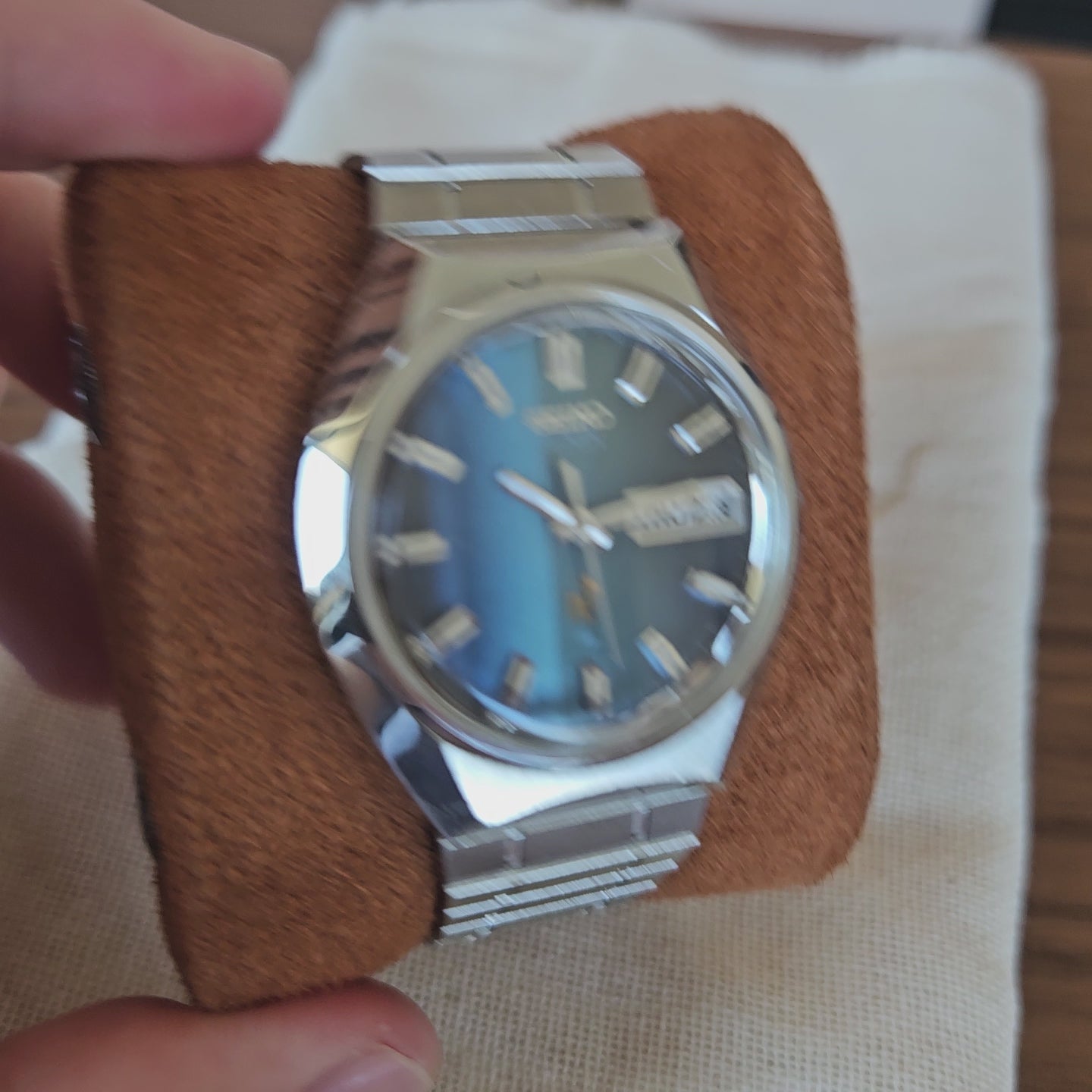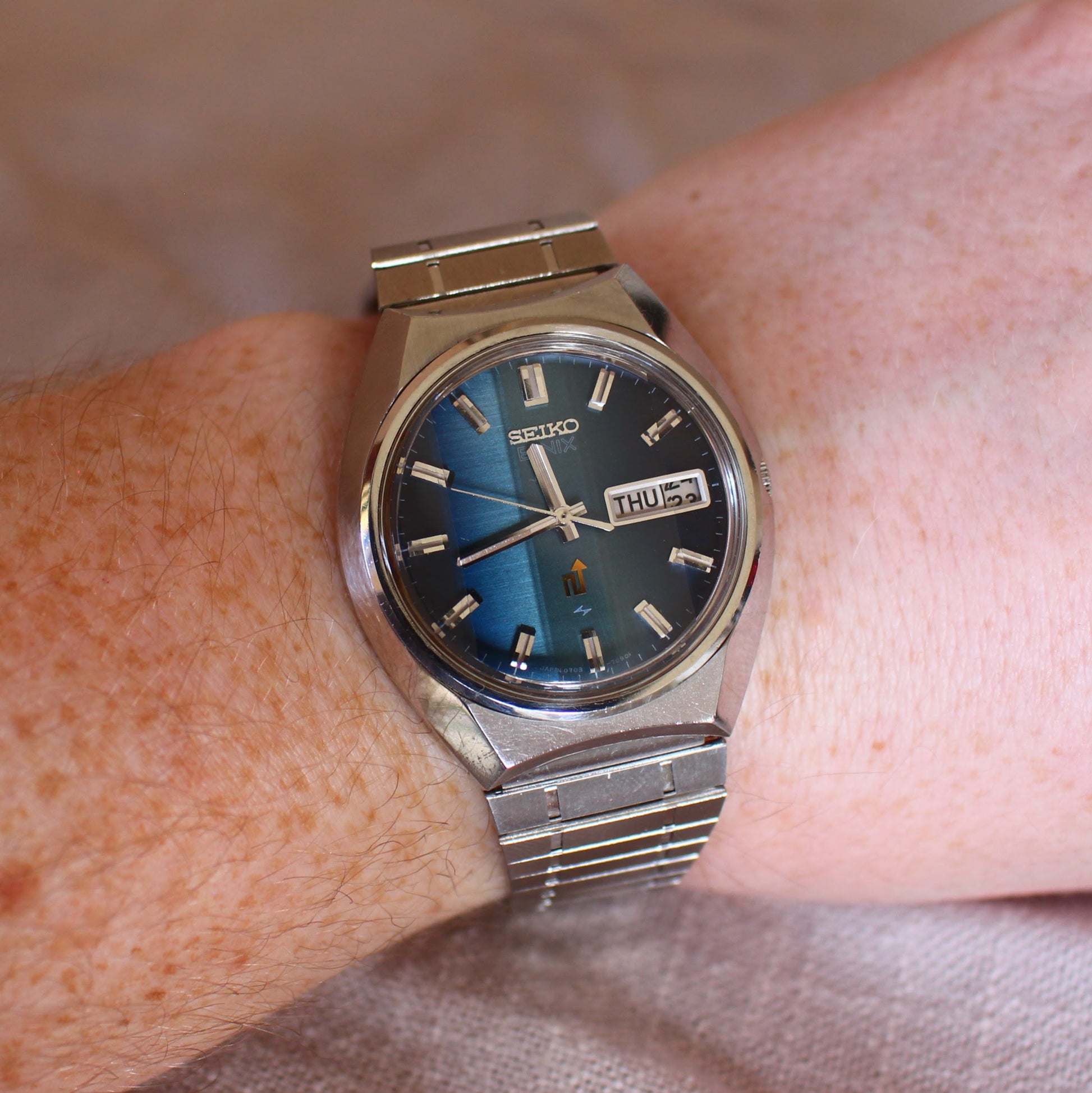 The watch is presented in amazing overall vintage condition, particularly for a piece of this era. The rare internally faceted crystal is in great condition. The blue brushed dial is also in great, clean condition. The stainless steel case is in amazing shape, retaining its sharp, original brushed finish, suggesting it is unpolished. It has been fitted with a period-correct Japanese 'Bear' aftermarket bracelet that suits the watch very well. The watch has been tested and is both fully functioning correctly and keeping accurate time.