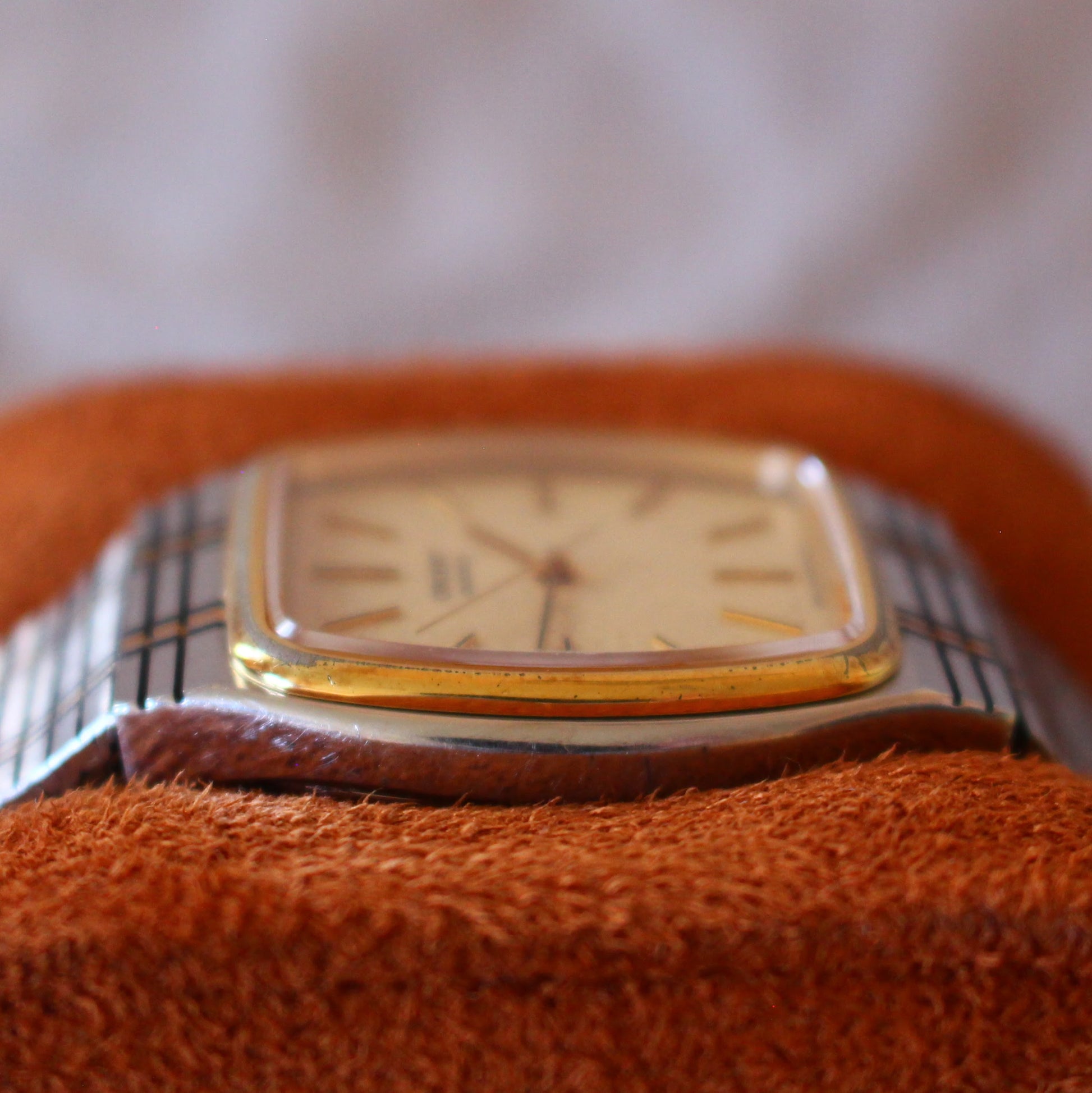 This is a classic Orient women's quartz watch from the 1980s, showcasing the elegant and reliable design language of the era. This timepiece features a sophisticated two-tone finish, with a gold-tone bezel complementing the stainless steel cushion-shaped case. Its beautiful champagne dial has a subtle frosted pattern, adorned with simple applied gold-tone indices and hands. Powered by a dependable Japanese quartz movement, this watch comes fitted on its original, matching striped bracelet.
