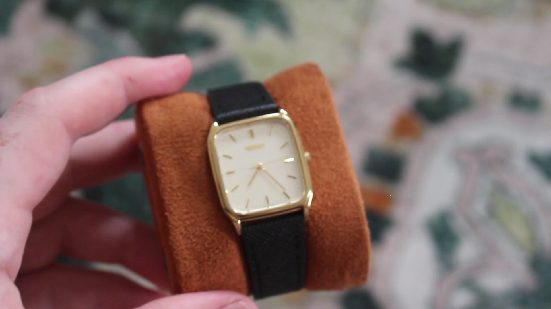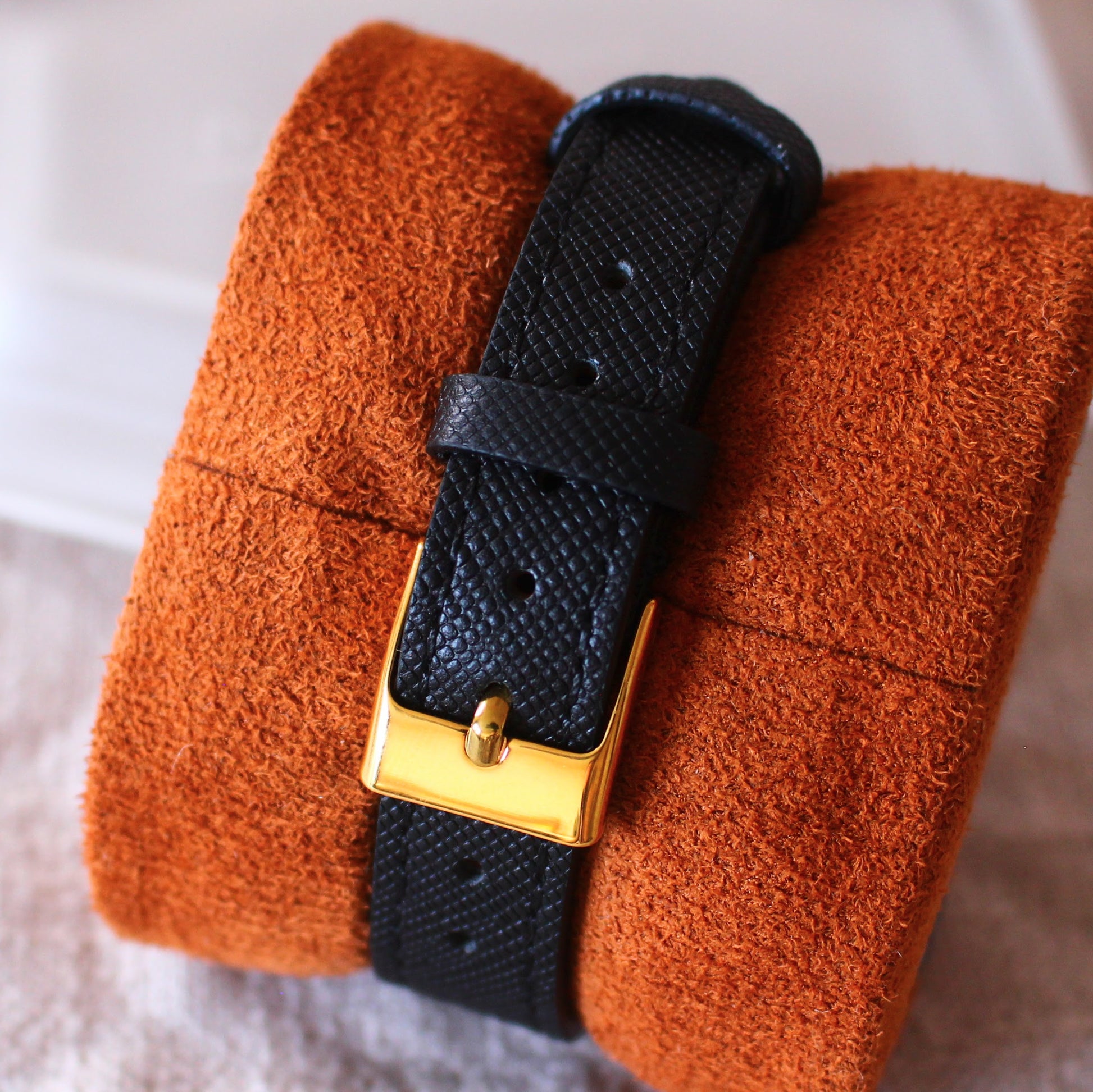 The crystal is in great condition with no noticeable marks, allowing the dial’s fine texture to stand out. The case is also in excellent shape, retaining a clean, sharp finish. It’s fitted with a new black saffiano leather strap, which pairs nicely with the gold case and keeps the overall look timeless and balanced.