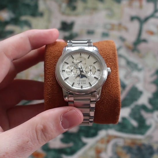 These Citizen moon-phase models remain one of the best value propositions in vintage Japanese watches: genuinely interesting, beautifully made, and still flying under the radar compared to equivalent Swiss pieces. Overall great condition, some minor marks on the crystal but overall great for its age.