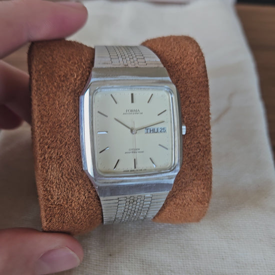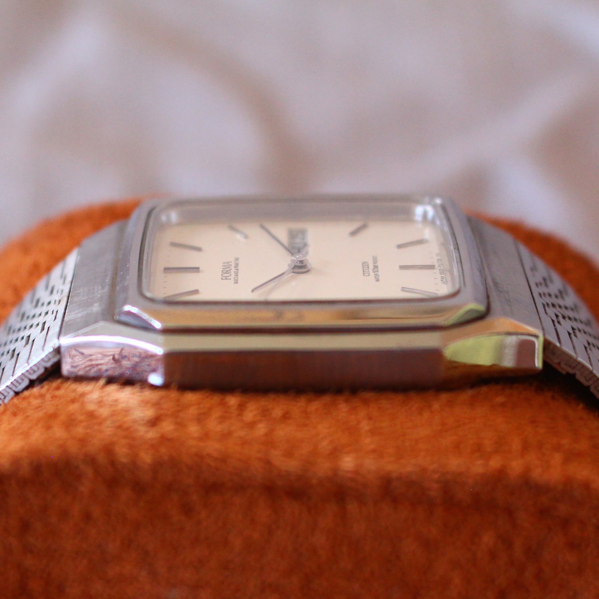 Presenting a stylish Citizen Forma quartz watch, embodying classic 90s Japanese design and construction. The Forma line often featured sophisticated designs, typically for the domestic market, and this example showcases that aesthetic beautifully with its elegant stainless steel finish across the square case and bracelet. It features a white dial, applied indices, and a practical Day-Date window at 3 o'clock. A particularly convenient feature is the original bracelet's sliding clasp mechanism, allowing for easy size adjustments without needing to remove any links. It runs on a reliable Citizen quartz movement made in Japan. It has both a Kanji and English Day wheel.