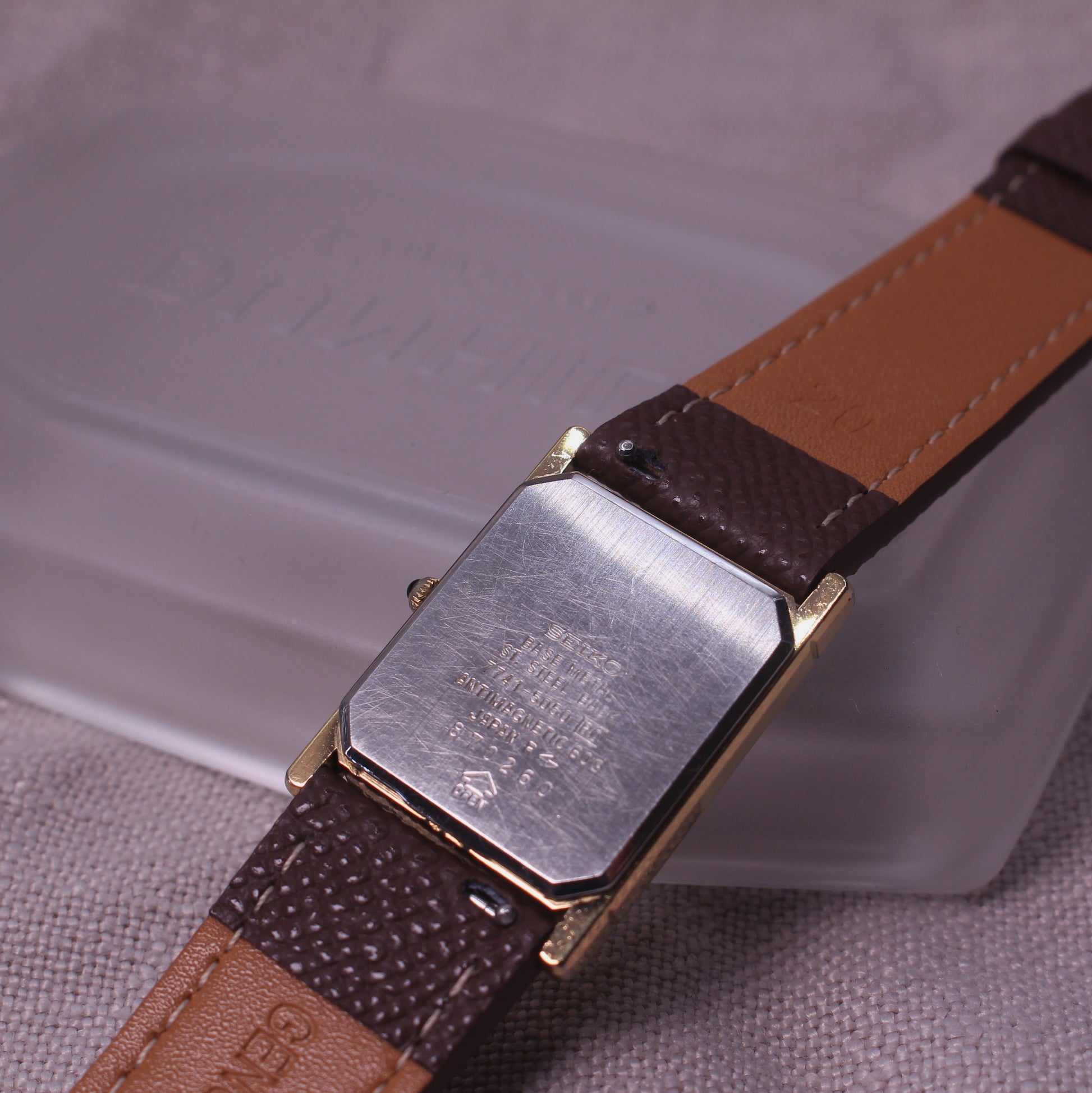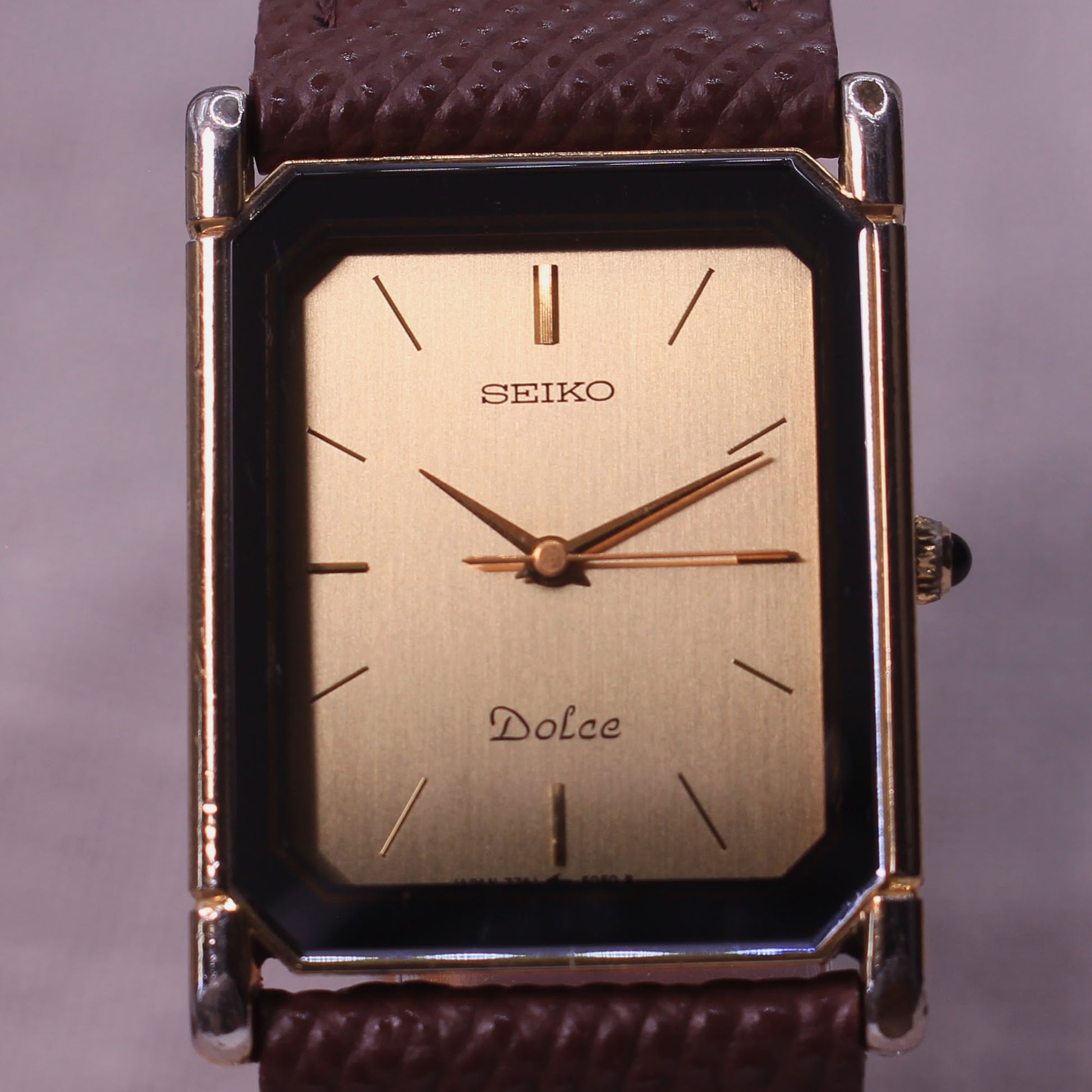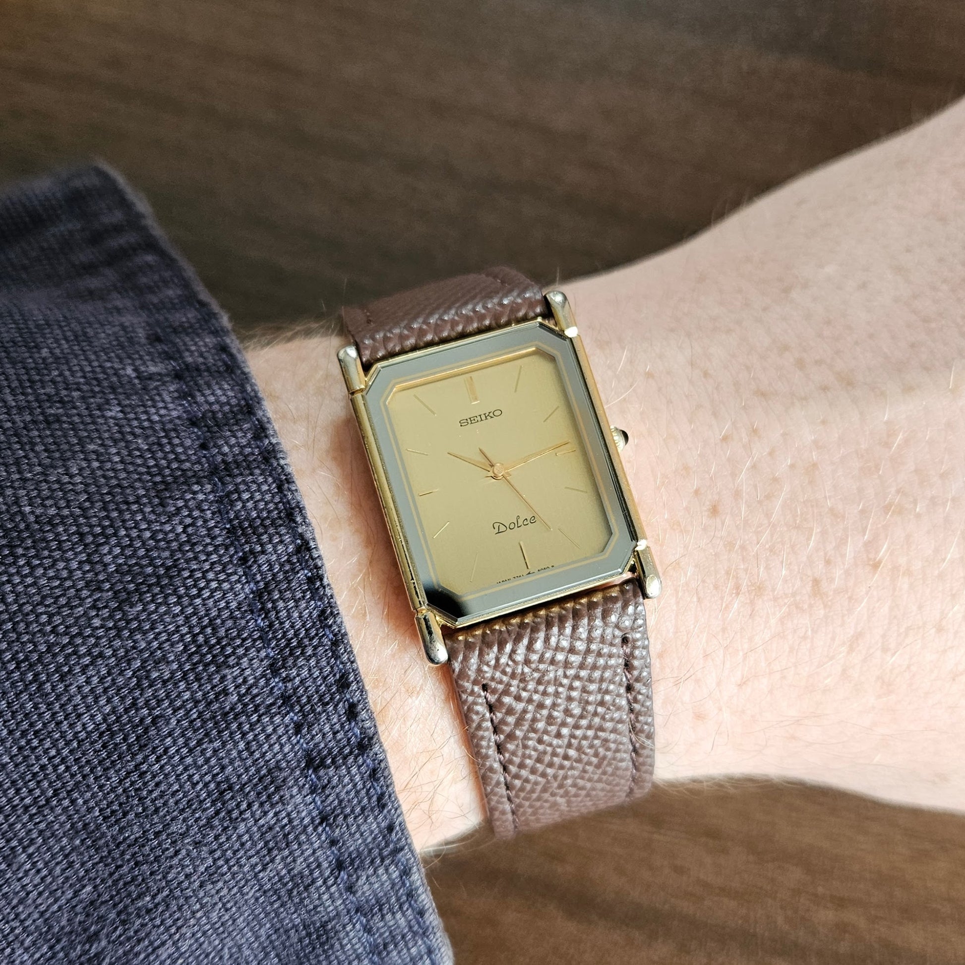 A 1988 Seiko Dolce 7741-5050, representing Seiko’s refined late-80s dress watch design. The rectangular case with articulated lugs gives it a distinctive tank-style profile, while the brushed gold dial framed by a silver-toned border adds depth and contrast. Slim baton indices and elegant hands keep the look minimal and balanced — classic Dolce restraint with just enough visual detail to stand out. Fitted to a brand new brown leather dress strap, it wears clean and sophisticated on wrist.