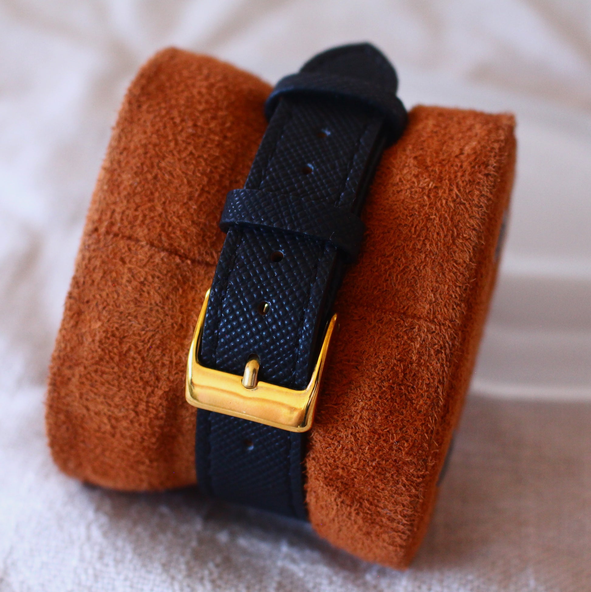 The watch is fitted with a saffiano leather strap, pairing perfectly with its angular, modernist styling and giving it an elegant contemporary wear.