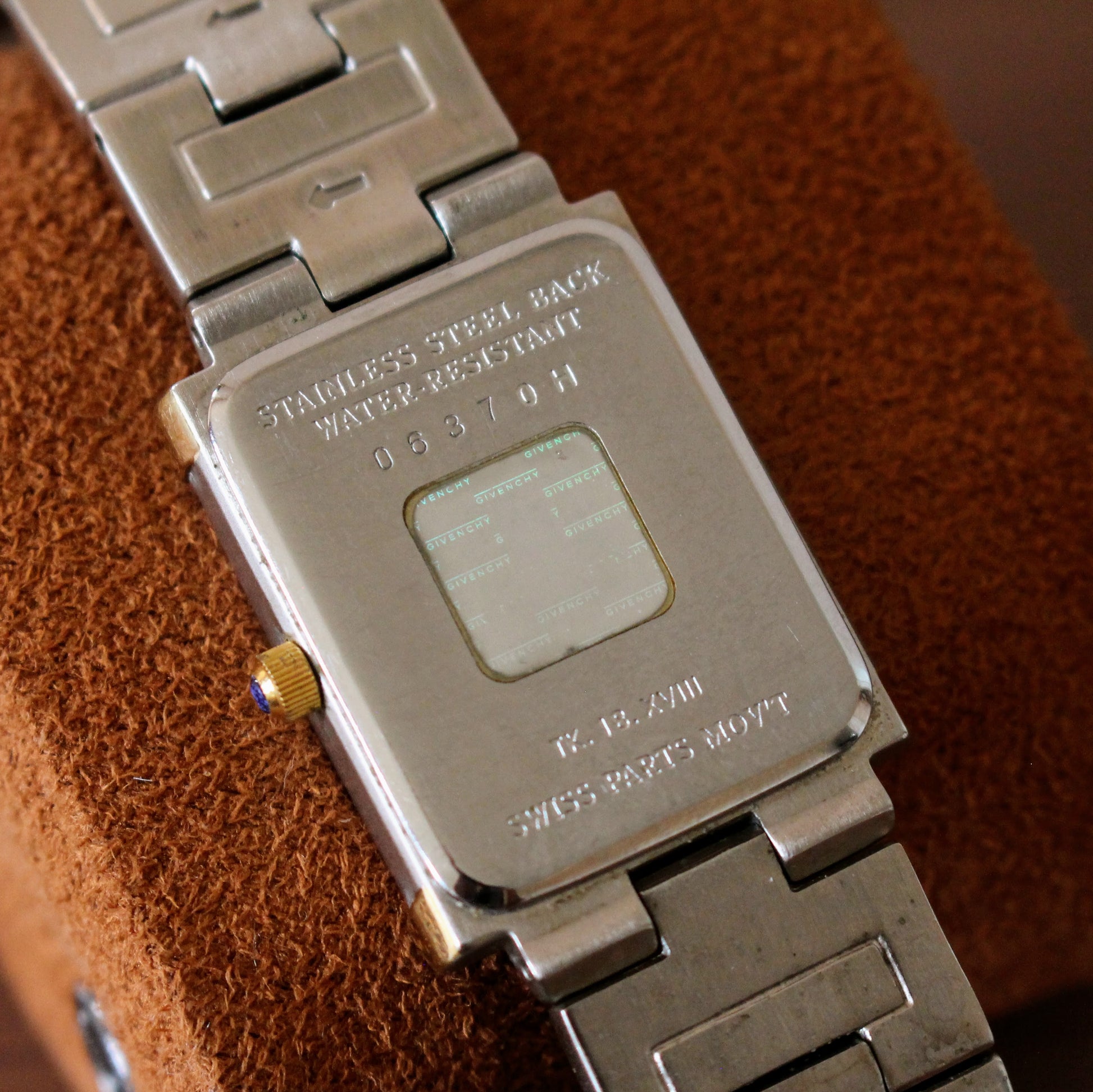 Inside is a Swiss Ronda quartz movement, which is exactly what you want to see in a genuine Givenchy watch from the 90s. These movements were widely used by luxury fashion brands at the time for their reliability and ease of long-term ownership, making this a practical vintage piece rather than something fragile or temperamental.