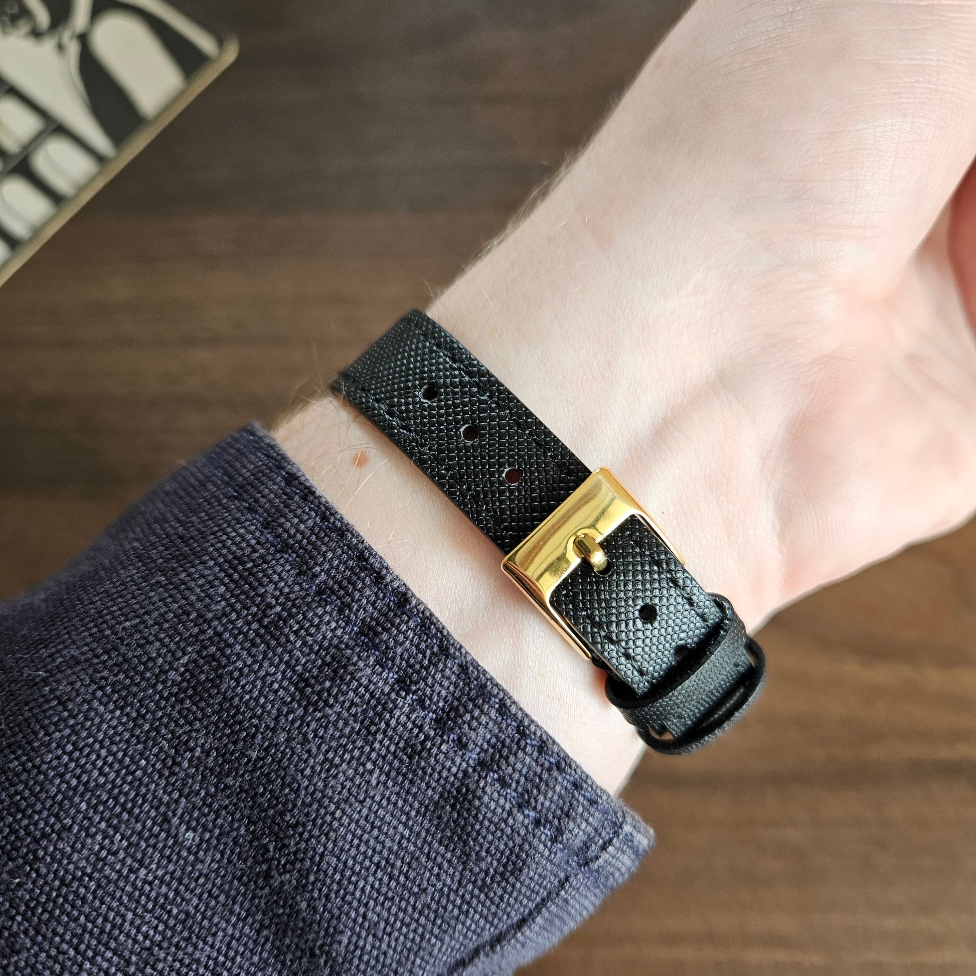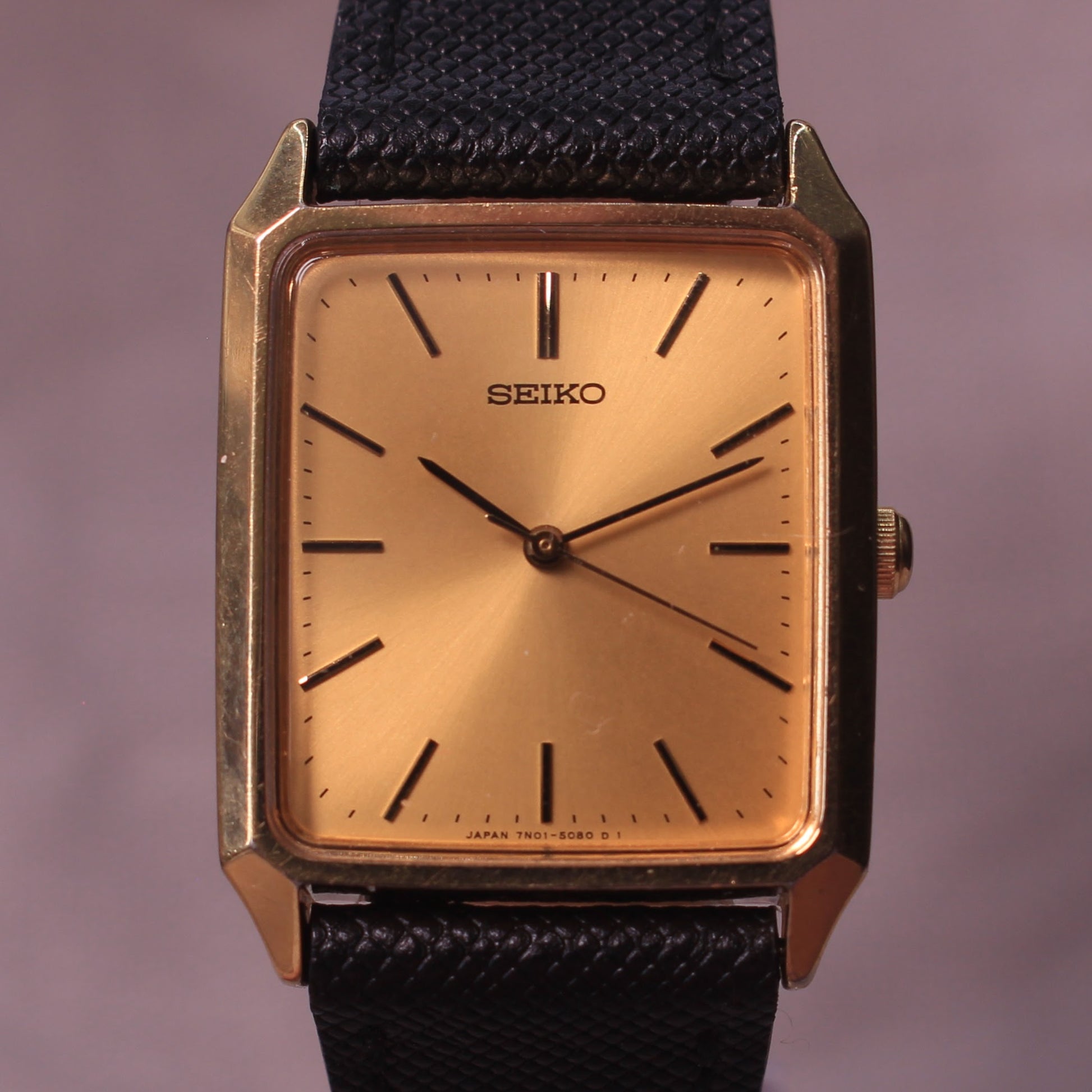 A 2001 Seiko Spirit 7N01-5060 featuring a sharp gold square case and warm sunburst champagne dial. The minimalist layout with slim black-accented baton markers and clean hands gives it a refined, understated look typical of Japanese dress watches. Powered by the reliable Seiko 7N01 quartz movement, this is a simple, elegant everyday vintage piece with strong proportions on the wrist.