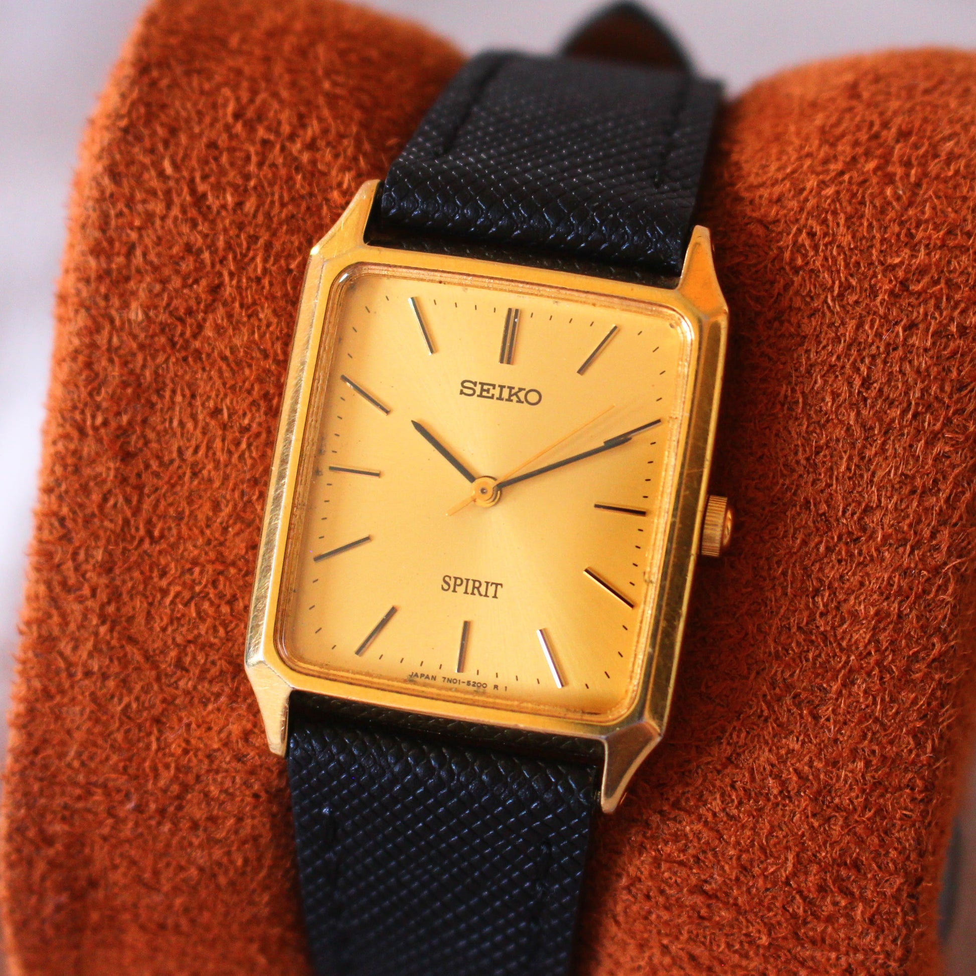 This is a classic Seiko Spirit quartz dress watch, reference 7N01-5180, dating from the year 2000. The Spirit line often represents stylish and high-quality models from Seiko, typically aimed at the Japanese Domestic Market (JDM), and this piece embodies that clean, sophisticated aesthetic. The watch features a handsome gold-tone rectangular 'tank' style case with faceted lugs, framing a beautiful champagne sunburst dial. The dial is adorned with simple applied stick indices and contrasting black hands for excellent legibility. It is powered by the reliable Seiko 7N01 quartz calibre and has been fitted with a brand new black Saffiano leather strap.