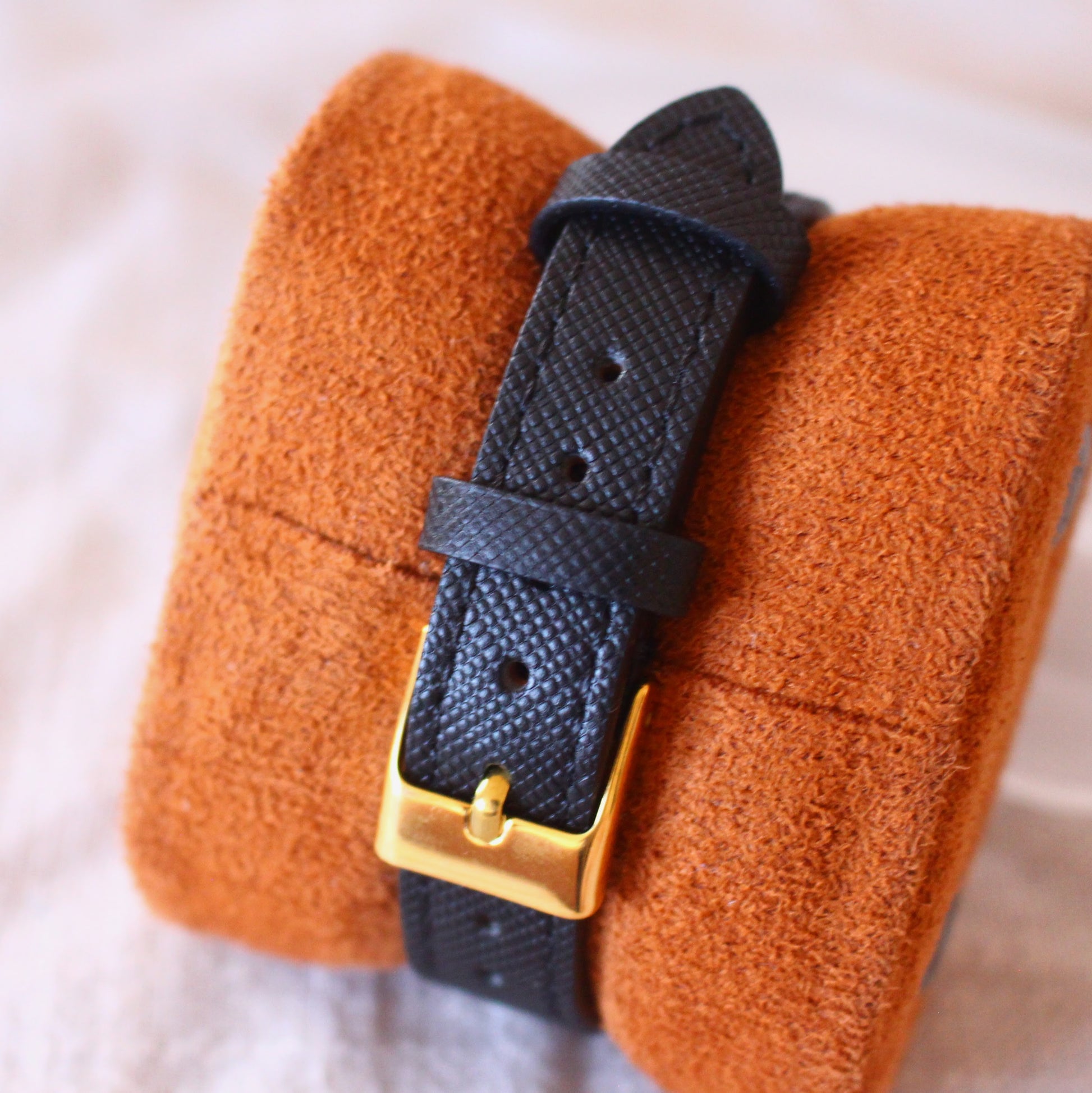 The watch is presented in great overall condition, reflecting careful ownership. The crystal is in great shape, clear and free from noticeable marks. The champagne sunburst dial is also in great condition. The gold-tone case is similarly well-preserved, showing light signs of previous wear. The Saffiano leather strap is brand new and unworn. The watch has been tested and is both fully functioning correctly and keeping accurate time. Please review the photos to appreciate its excellent condition.