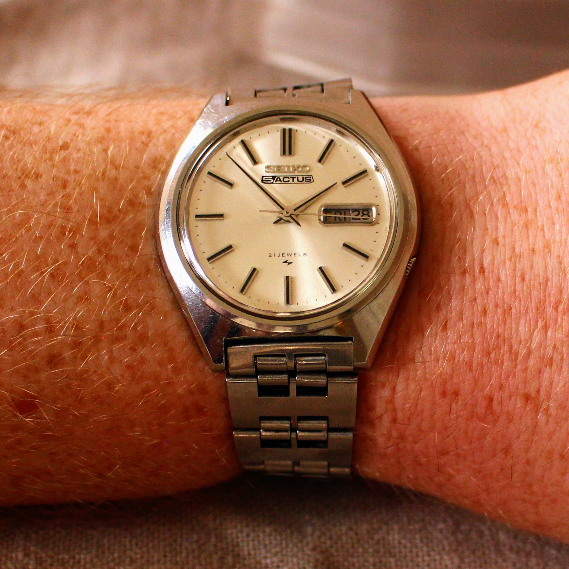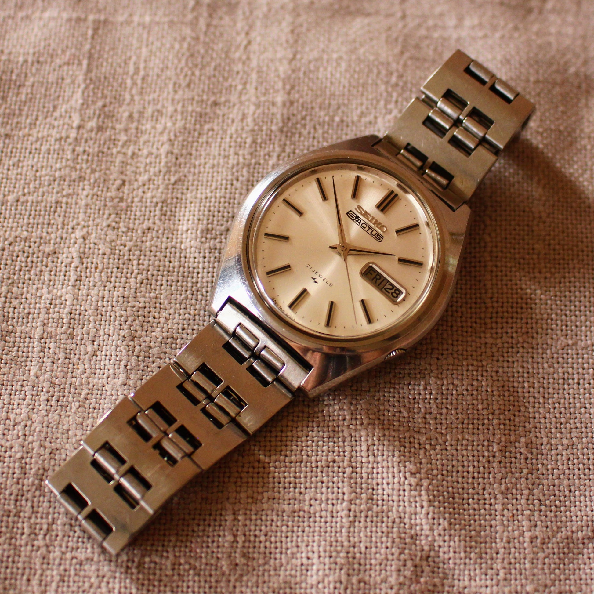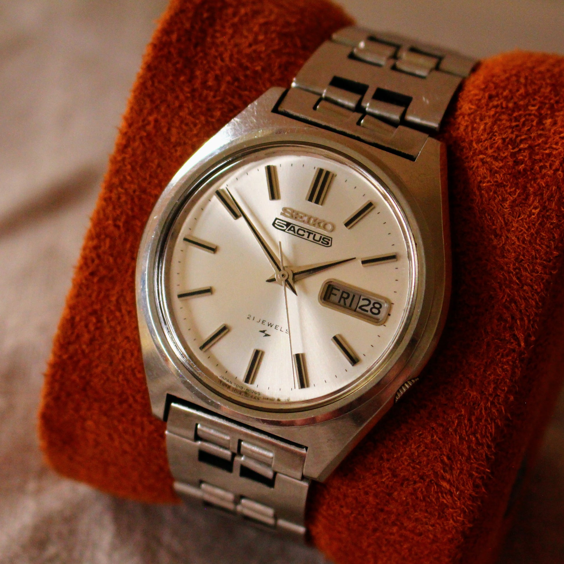This watch features a clean silver sunburst dial with applied indices and the signature Seiko 5 Actus branding. It includes a practical quick-set Day-Date complication (day wheel likely has both Kanji and English options) displayed at 3 o'clock, powered by a 21-jewel Seiko automatic movement 7019 calibre. The stainless steel cushion/tonneau case has the typical Actus crown position at 4 o'clock. It's currently fitted with a stainless steel bracelet that shows signs of light use – while it suits the watch, its exact originality is uncertain; it could be aftermarket or perhaps just a less common Seiko band from that period.