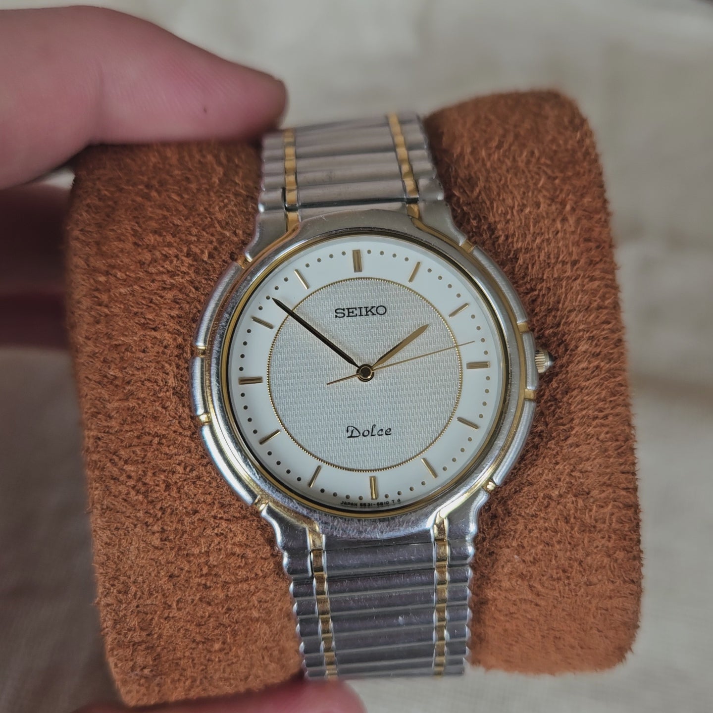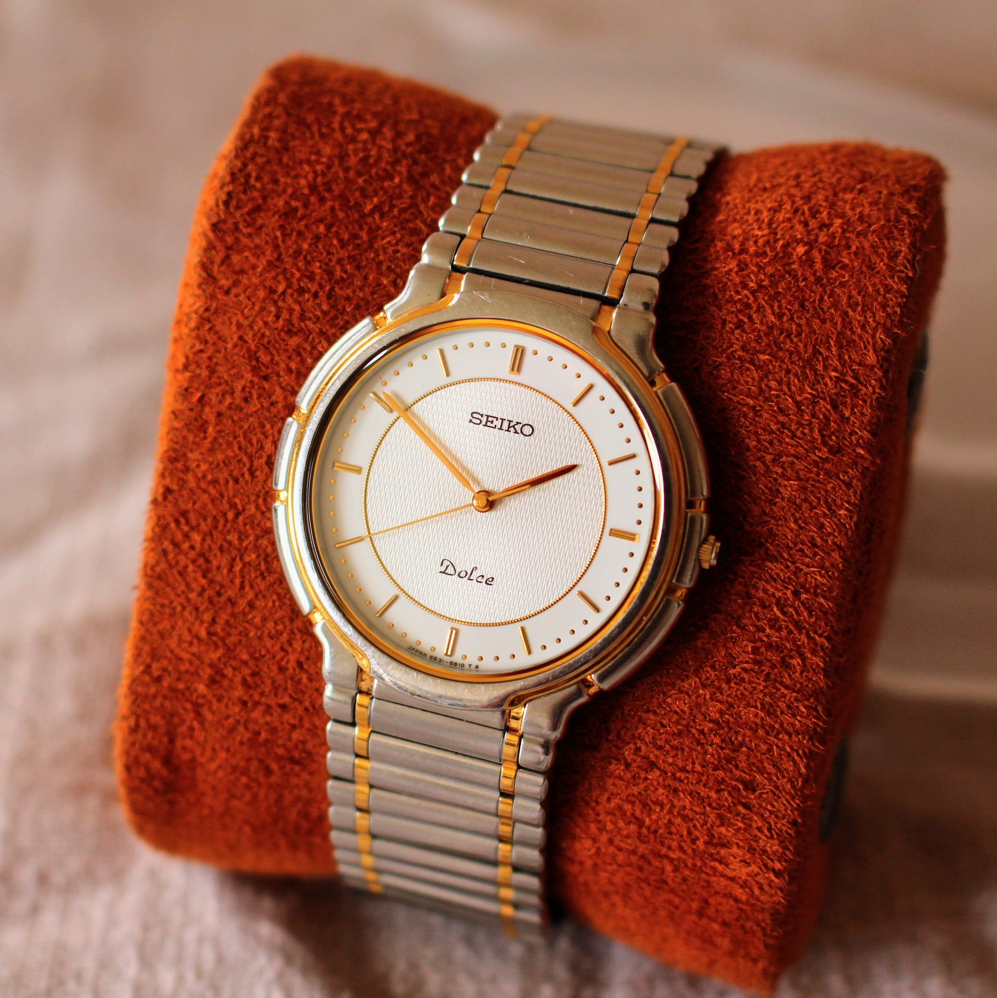 This is a beautiful and exceptionally slim Seiko Dolce quartz dress watch, reference 5E31-6B20, from 1990. The Dolce line was one of Seiko's premium offerings, often only for the Japanese Domestic Market, renowned for its sophisticated design and high-quality quartz movements. This model features an elegant two-tone (stainless steel and gold-tone) case, housing a beautiful white dial with a textured inner pattern. It is notable for its ultra-thin profile, measuring just 5.5mm thick, and is powered by the reliable Seiko 5E31 quartz calibre. It comes fitted on its original, integrated and signed Seiko Dolce two-tone bracelet.