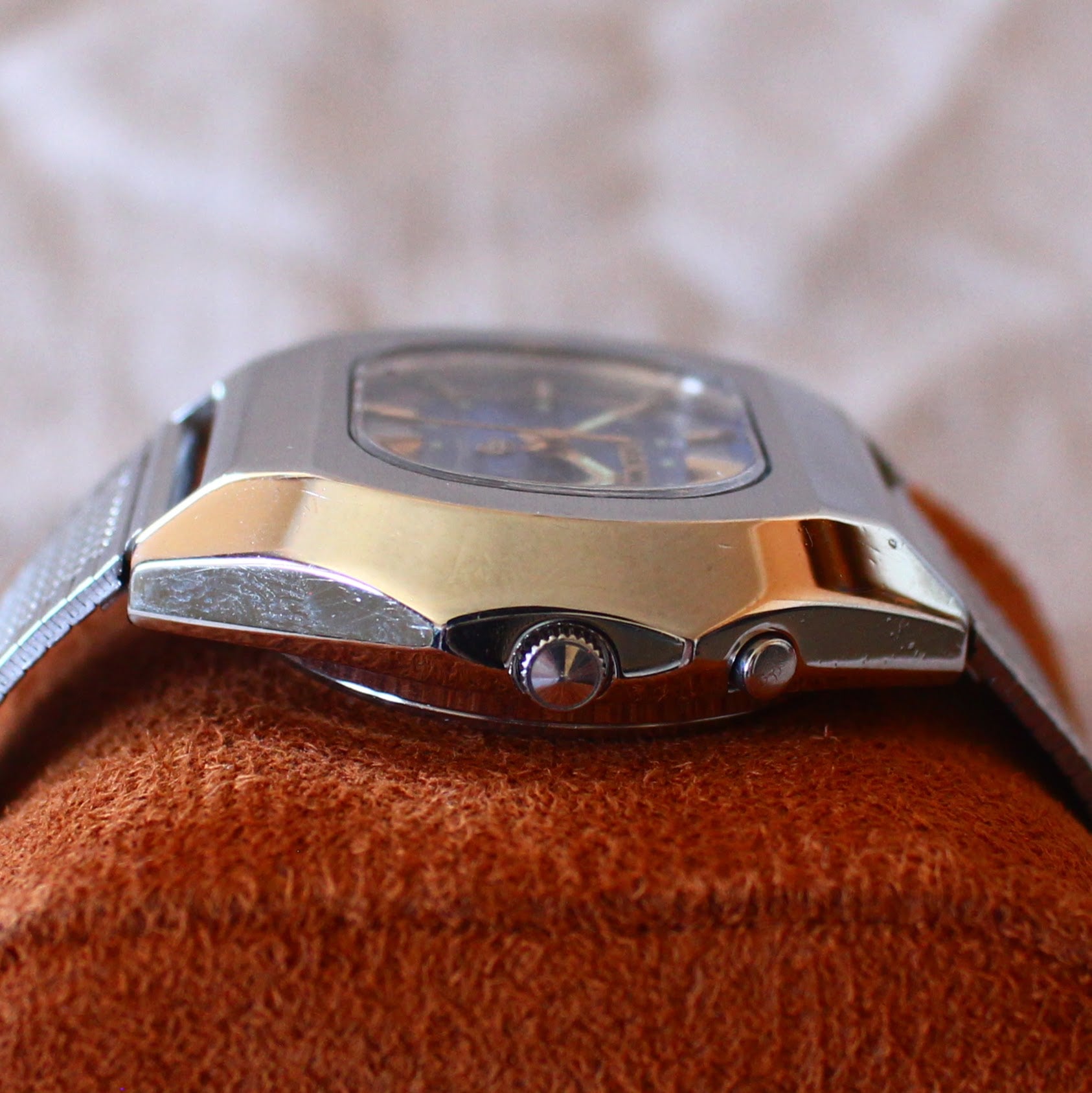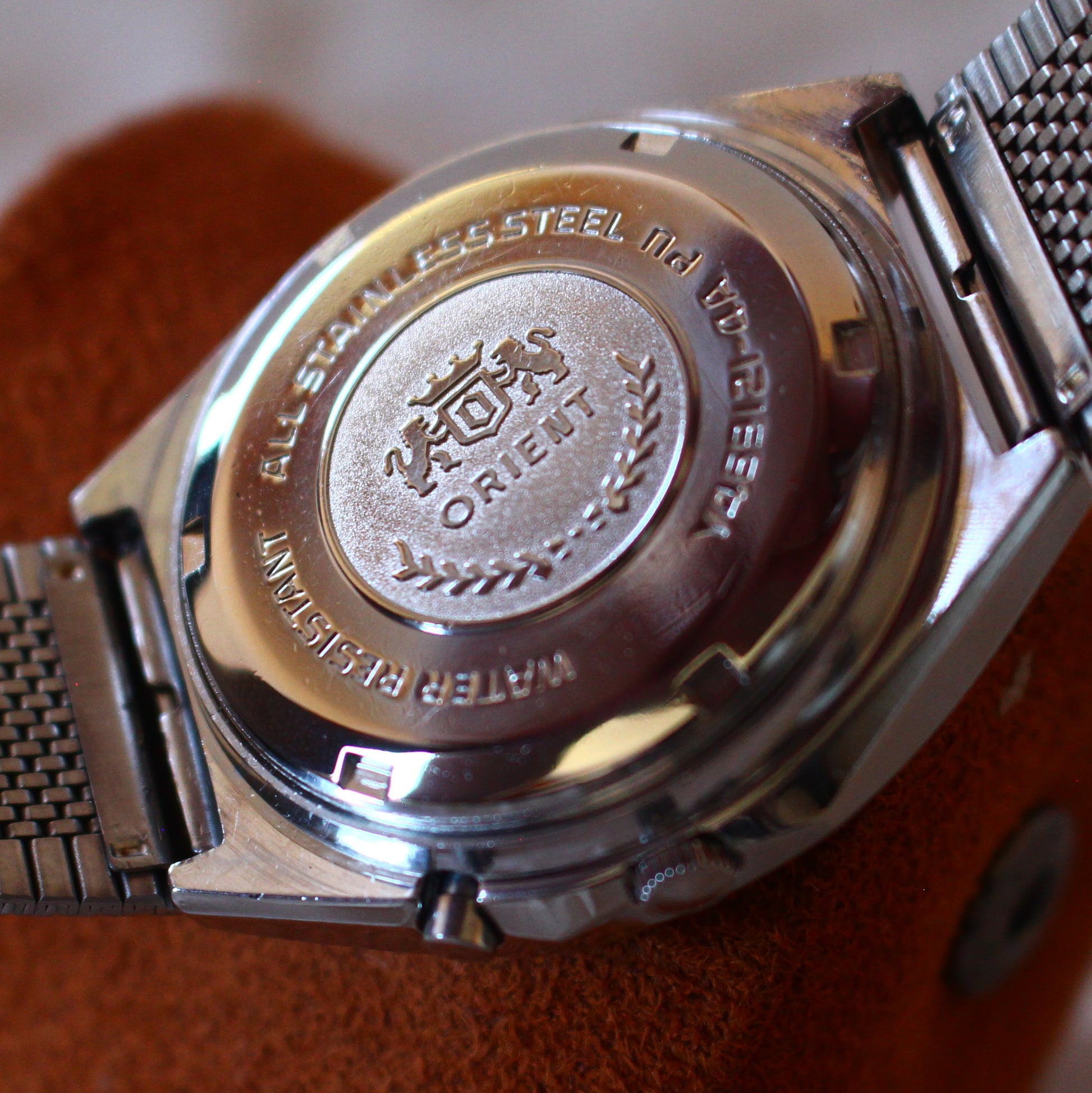 The cushion-style case is classic 1970s Orient: angular, distinctive, and full of wrist presence without feeling oversized. The original acrylic crystal remains in good vintage condition and adds the right amount of retro warmth to the piece.