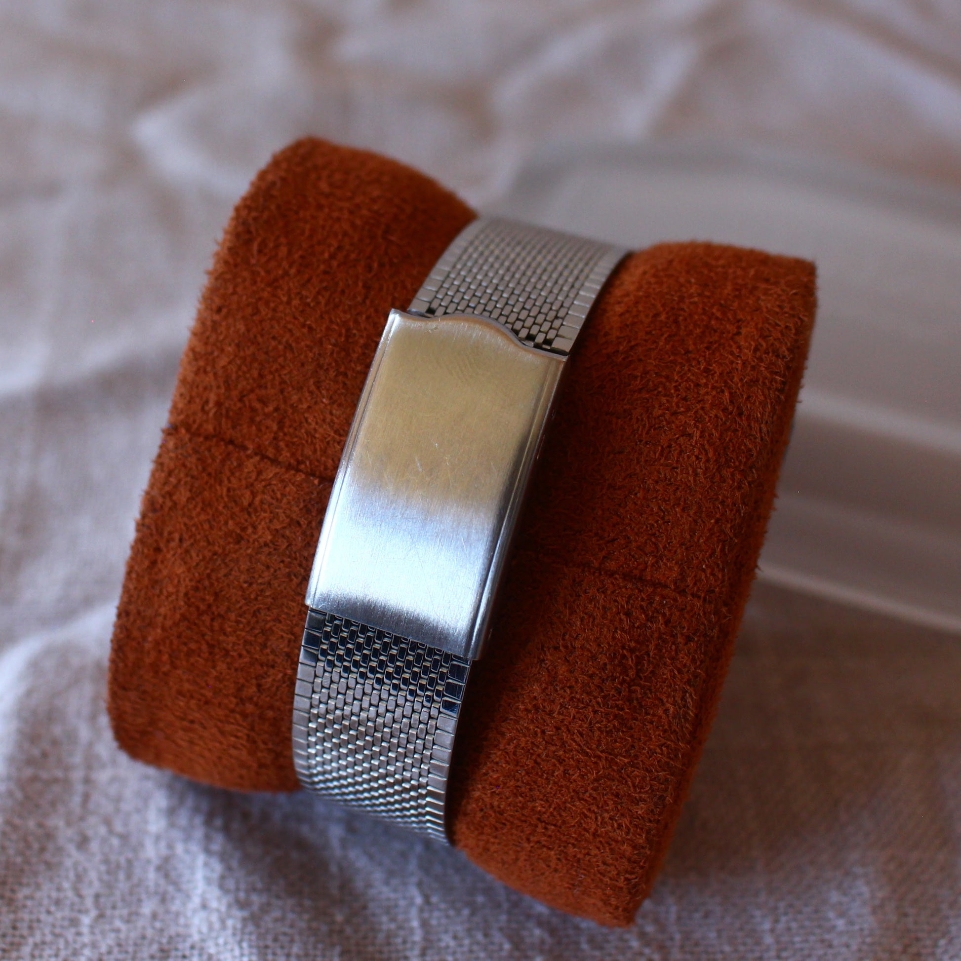 This example is paired with a high-quality Japanese Maruman stainless mesh bracelet, a comfortable and easily adjustable aftermarket pairing that suits the case shape beautifully.