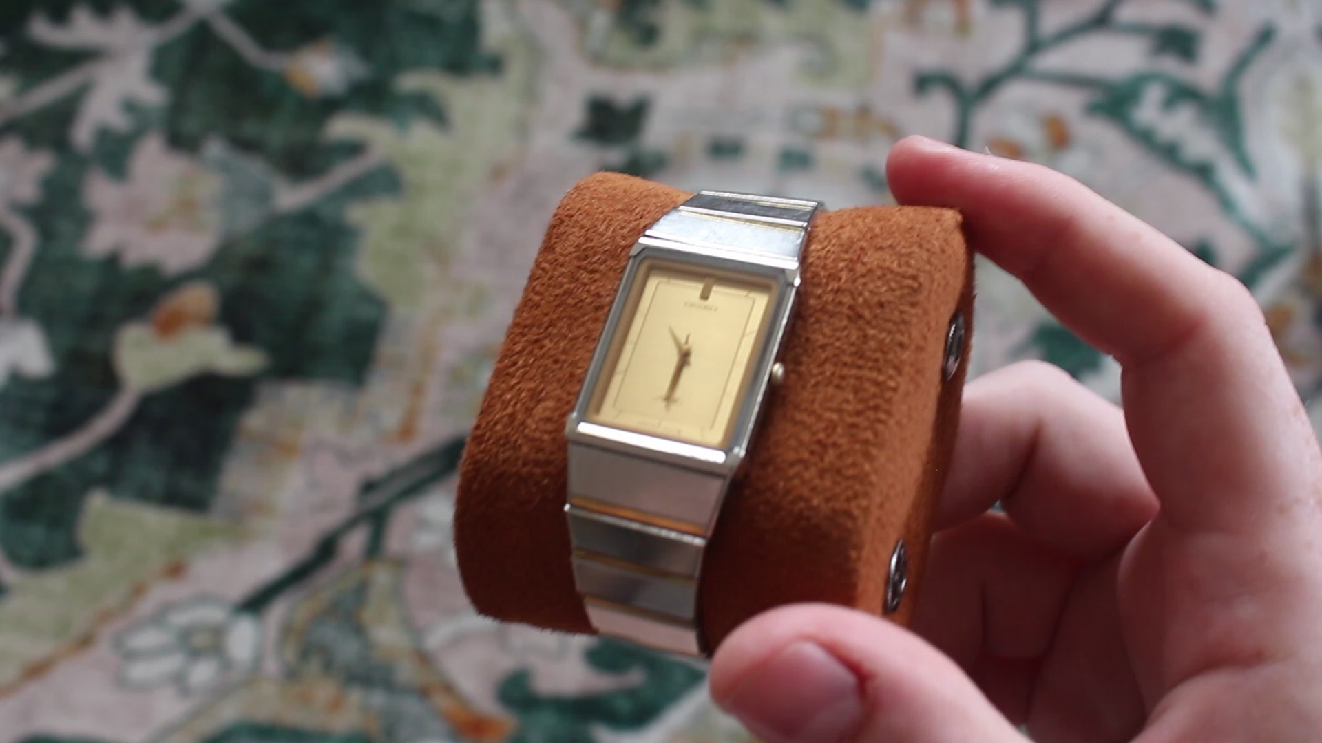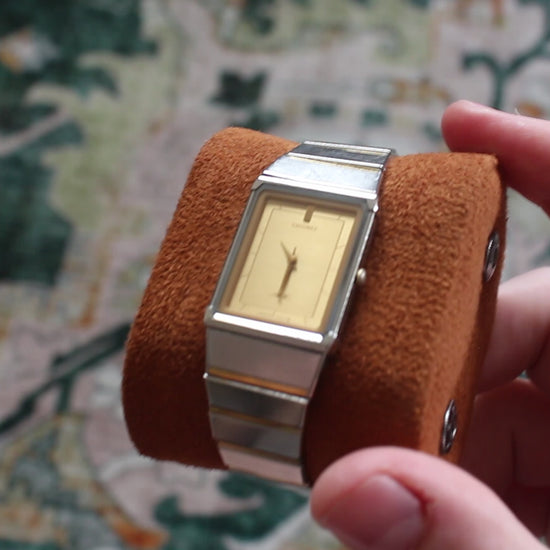 This piece features a striking gold brushed dial with minimalist markers and a bold rectangular case design that leans heavily into classic 1980s Japanese geometry. The result is a watch that feels both architectural and elegant — a proper dress watch with personality, rather than something generic.