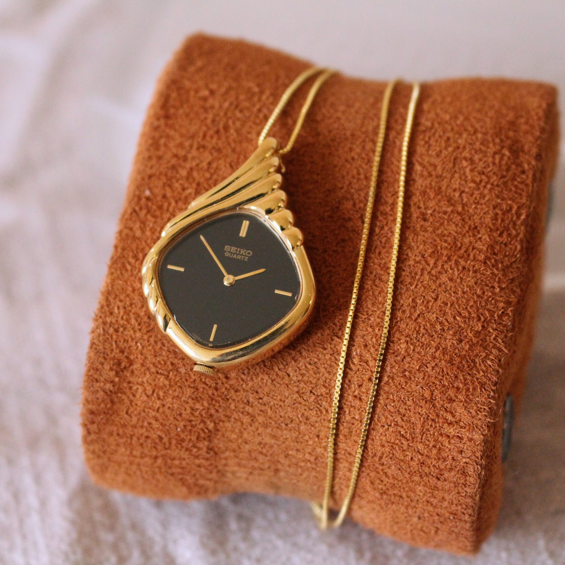 Vintage Seiko Black Dial Art Deco Womens Watch Necklace - Fully Working! - 1981