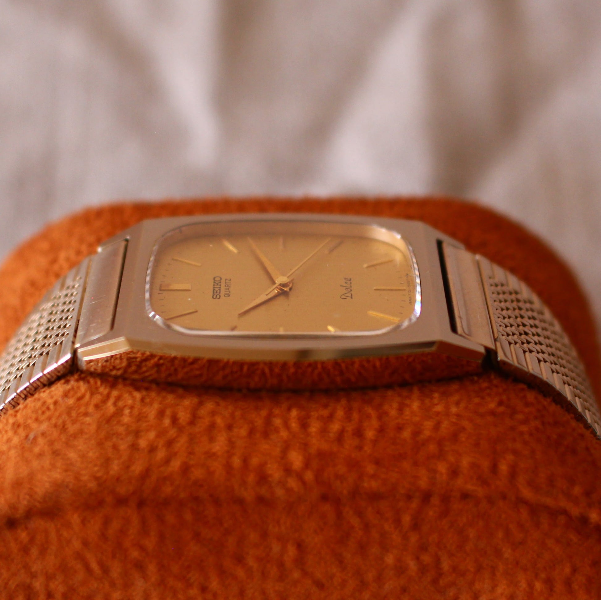 This is a truly superb Seiko Dolce, reference 7731-5100, from 1983, representing the intersection of high-end design and advanced material science from Seiko's premium catalogue. As a flagship quartz dress watch line, the Dolce series often featured cutting-edge technology. This model showcases an elegant two-tone case, a stunning vertically striped gold dial with applied indices, and a crown set with its original, intact cabochon. It is powered by the reliable Seiko 7731 quartz calibre and retains its original mesh bracelet with a convenient adjustable sliding clasp.