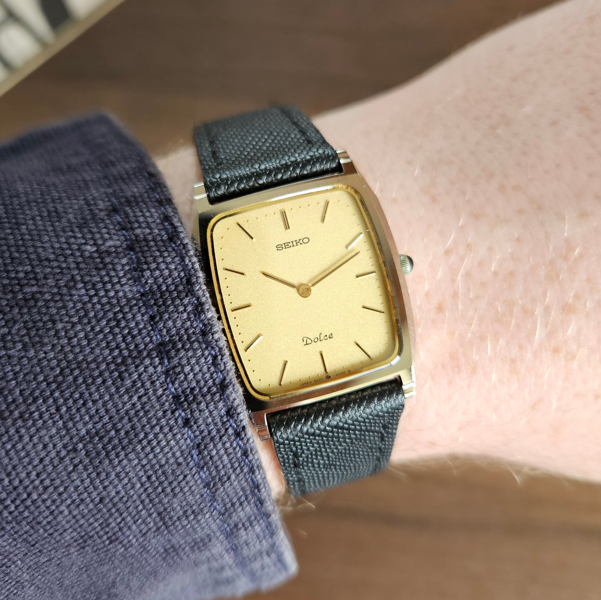 A 1986 Seiko Dolce 9530-5030, a refined rectangular dress watch from Seiko’s premium JDM Dolce line. The mid-80s Dolce models are known for their slim proportions and high-grade materials, and this example features a beautifully textured champagne dial with a subtle sparkle effect that catches the light elegantly. The minimalist baton markers and clean handset keep the design restrained and distinctly Japanese in feel. The standout feature is the tungsten carbide case – an exceptionally hard, scratch-resistant material that was a true premium offering at the time and remains highly desirable today.