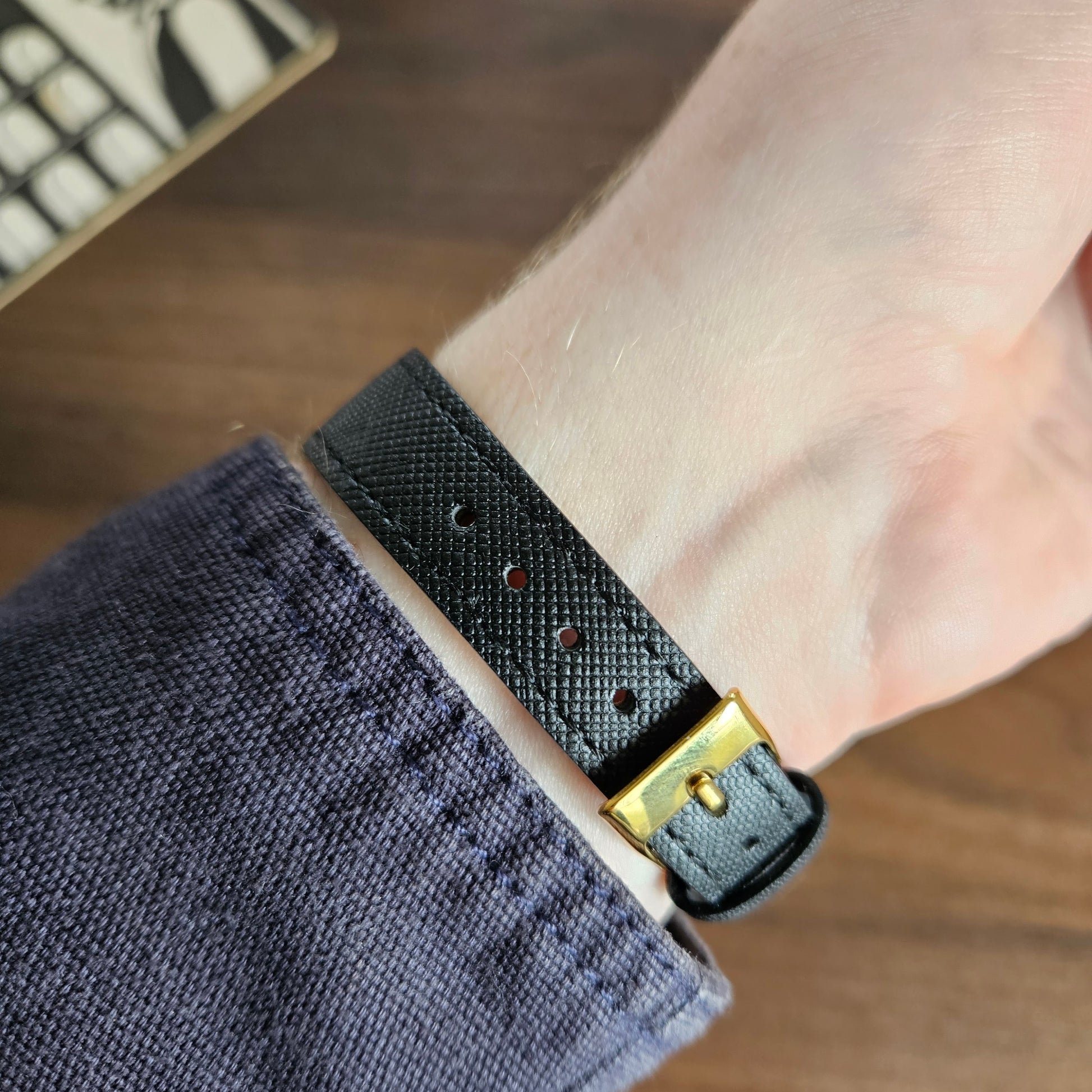 The watch presents in great overall condition. The crystal is clear, the dial is clean and vibrant, and the tungsten carbide case retains sharp lines with only light signs of age. It has been paired with a brand new saffiano leather strap that complements the gold tone of the dial beautifully. Extensively tested and working very well.