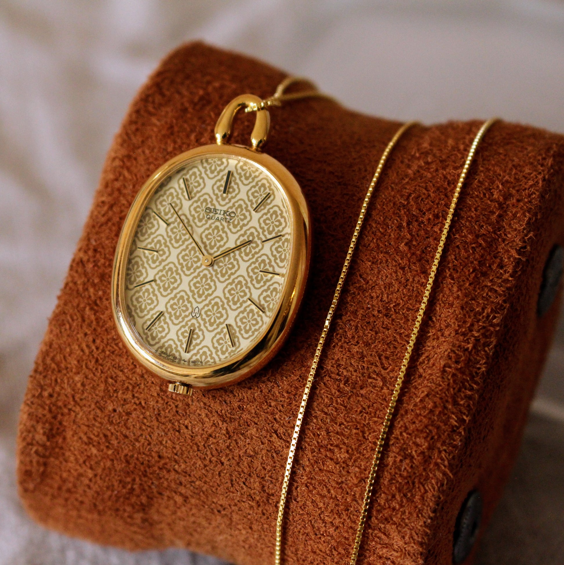 Vintage Seiko Gold Clover Patterned Watch Necklace - Fully Working! - 1979