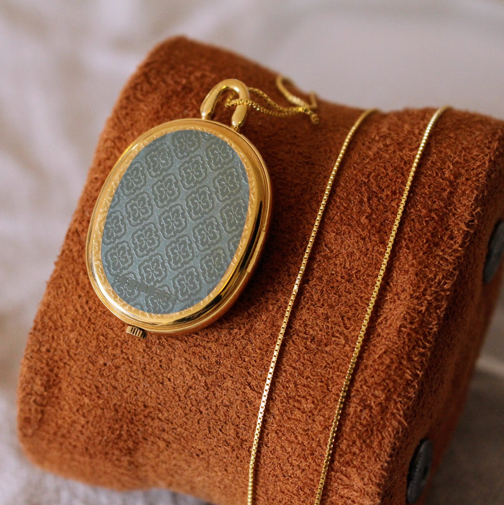 A pretty little watch necklace. Fully operational and working this is a great little piece. The patterning on both the dial and case-back are stunning. Currently on a 45cm gold tone chain, its a super unique gift for any watch lover. The back of the case still has the original protection so its evident this watch has seen very little wear.