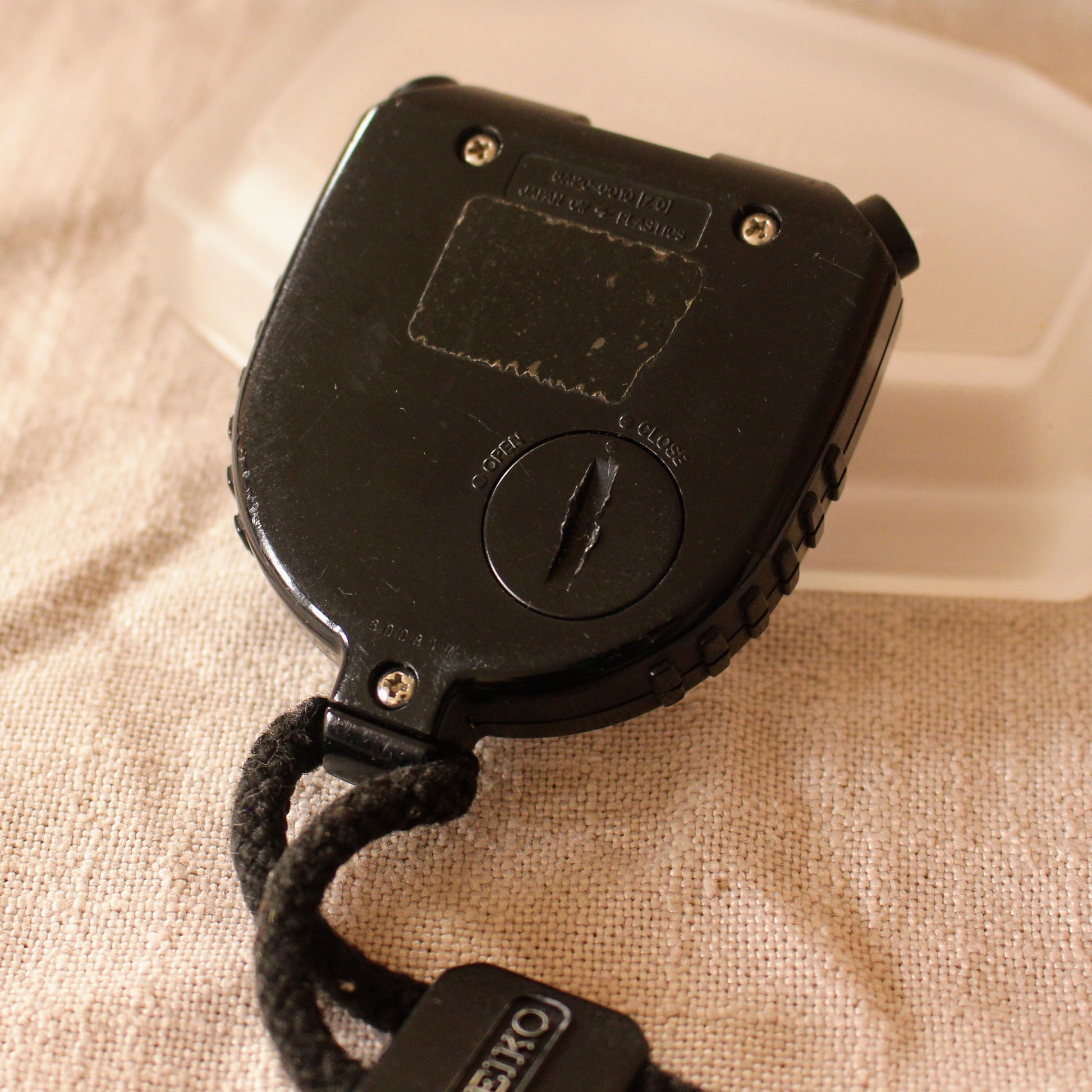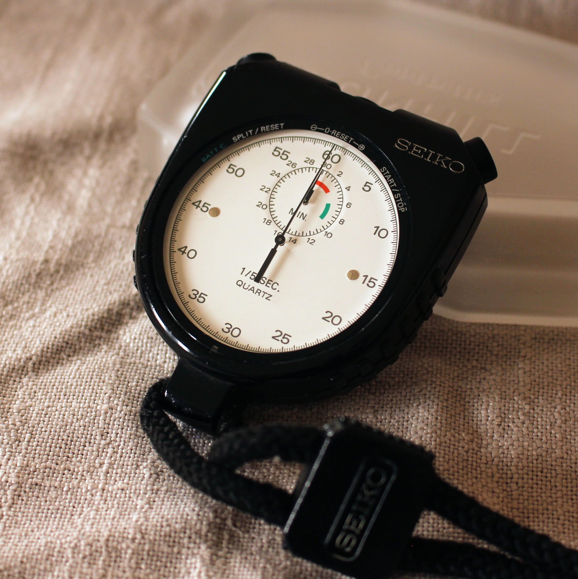 A rare and highly functional piece of Seiko's timing history from 1976. This early quartz stopwatch is offered in great working condition, complete with its original lanyard, storage bag, and box, making it a fantastic find for collectors or vintage tech enthusiasts.