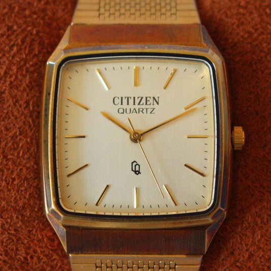 Vintage Citizen Quartz CQ Gold Tone Square Brass Case Patina Womens Watch - 80s